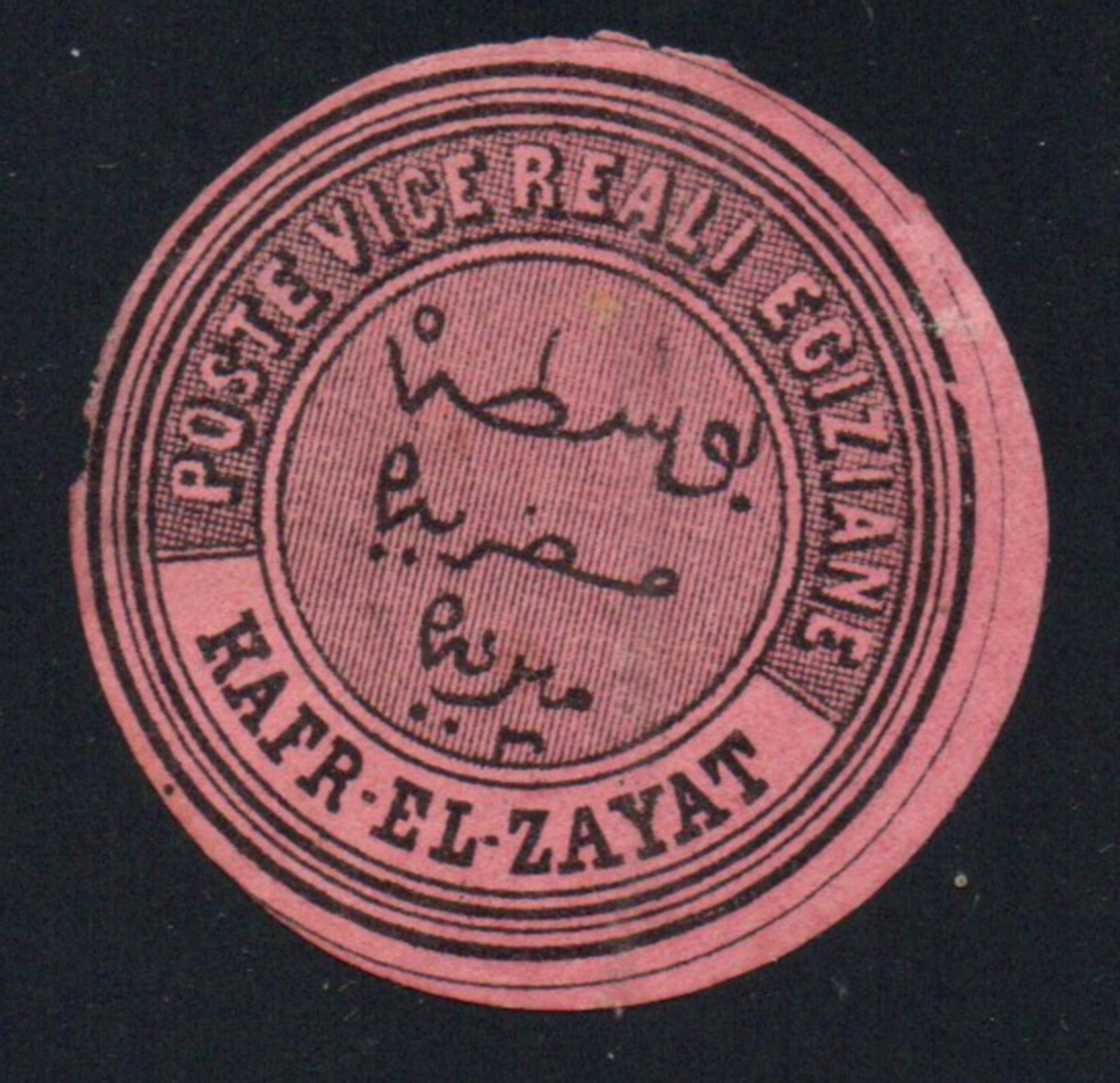 Inscribed “POSTE YICE REALI EGIZIANE” in white letters on a background of cross-hatching around the top arch; and town name in coloured letters around bottom of the same arch-panel. The whole enclosed by a circular frame of thick, thin and thick lines and finally, around outside, a double-thick line measuring 39 mm in diameter. The Arabic inscription, "Busta Masrieh Mirieh" - which means Official Egyptian Mail - is arranged in three lines in the centre in coloured lettering on a background of fine vertical lines. Printed in black on tinted paper, except as noted.